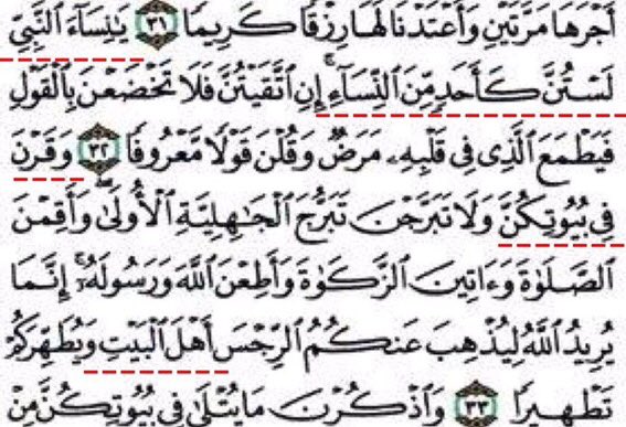 و ق ر ن ف ي ب ي وت ك ن و ل ا ت ب ر ج ن ت ب ر ج ال ج اه ل ي ة ال أ ول ى و أ ق م ن الص ل اة و آت ين الز ك اة و أ ط ع ن الل ه و ر س ول ه إ ن م ا ي ر يد الل ه ل ي ذ ه ب ع ن ك م الر ج س أ ه ل ال ب ي ت و ي ط ه ر ك م ت ط ه ير ا