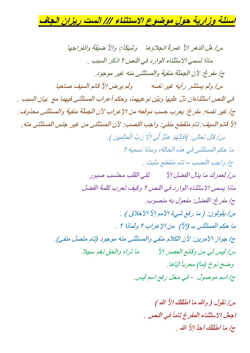 الاسئلة الوزاية حول موضوع الاستثناء للست ريزان احمد الجاف للصف السادس الاعدادي