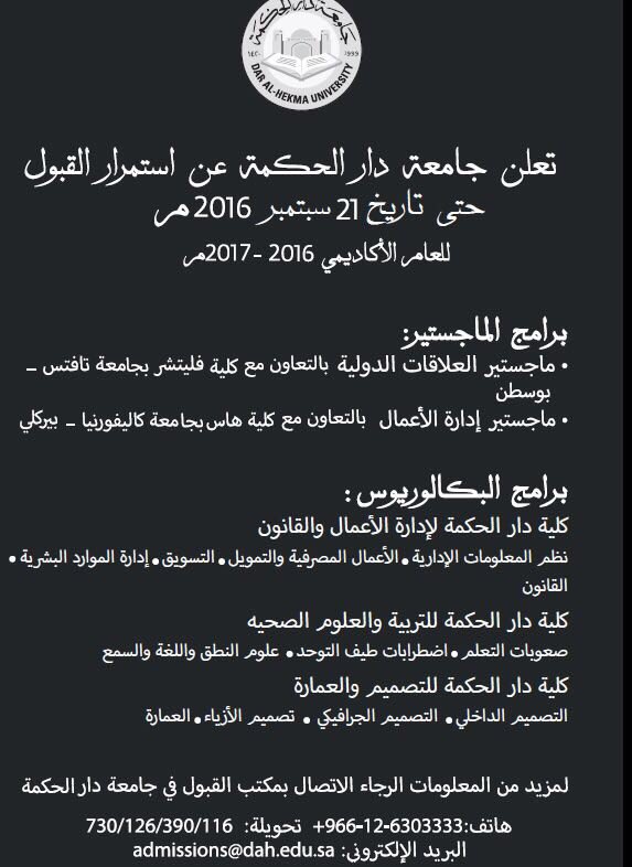 جامعة دار الحكمة On Twitter استمرار القبول حتى ٢١ سبتمبر منح جزئية زورونا في الجامعة 0535034123 Admissions Open Until 21 September