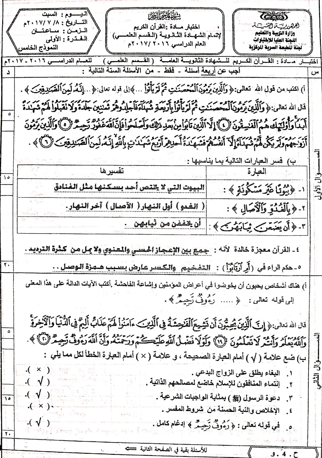 قران النموذج الخامس والاخير حلول نماذج وزارية ثالث ثانوي اليمن ملخصات الثانويه العامه في اليمن